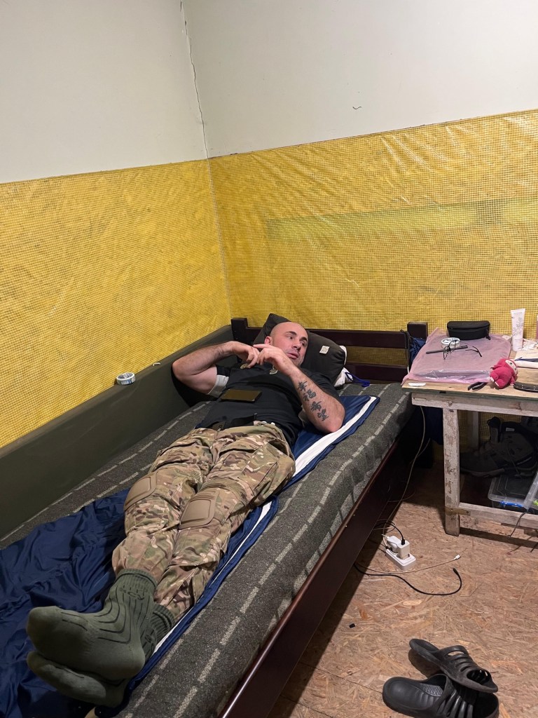 Beside him, a small toy – sent by his daughter – a quiet piece of home at the front.
